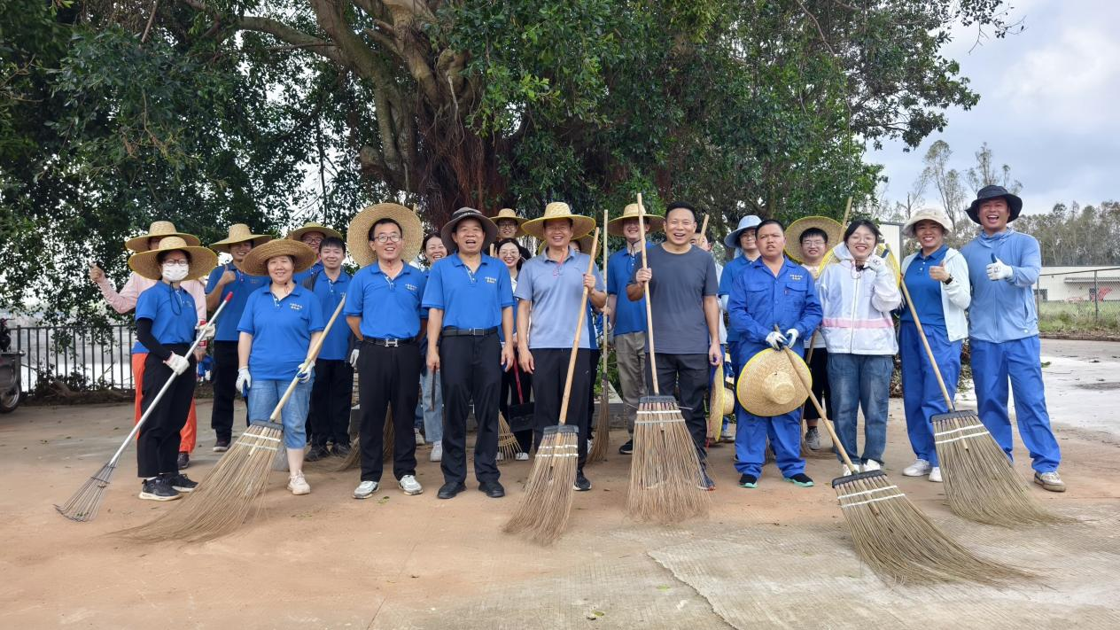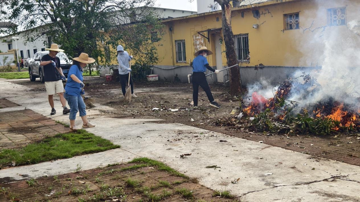 全员动员,凝聚合力攻坚难关。为加速灾后重建进程,10月9日上午,农机所号召全体干部职工赶赴受灾最严重的湖光所部,开展大规模集体劳动。现场呈现一派热火朝天的忙碌景象:有的职工手持油锯,精准切割横亘路面的倒伏树干;有的挥舞铁锹,奋力铲除淤积的枯枝杂物;还有人搬运散落枝叶,分类清理垃圾。各小组分工明确、密切配合,充分展现团结互助的精神风貌。经过连续奋战,原本杂乱的办公区、生活区逐渐恢复整洁。