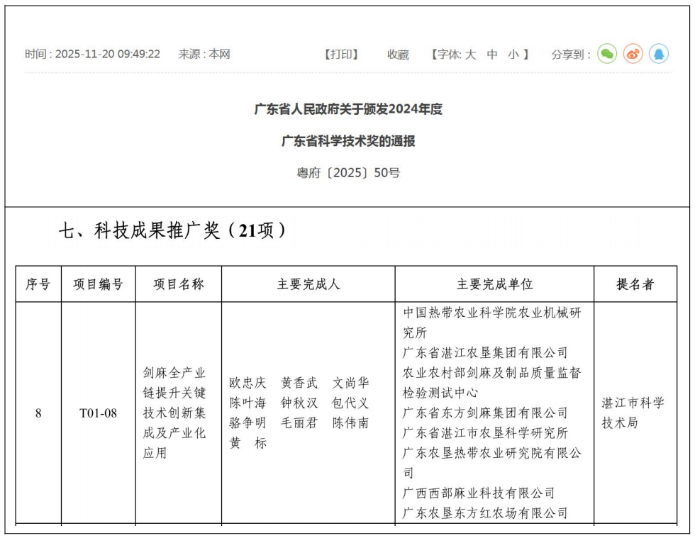近日,广东省人民政府公布 2024年度广东省科学技术奖获奖名单,由中国热带农业科学院农业机械研究所牵头,广东省湛江农垦集团有限公司、农业农村部剑麻及制品质量监督检验测试中心、广东省东方剑麻集团有限公司等7家单位共同参与完成的“剑麻全产业链提升关键技术创新集成及产业化应用”成果荣获广东省科技成果推广奖。