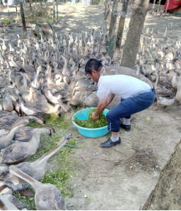 鹅群竞相采食鲜叶渣